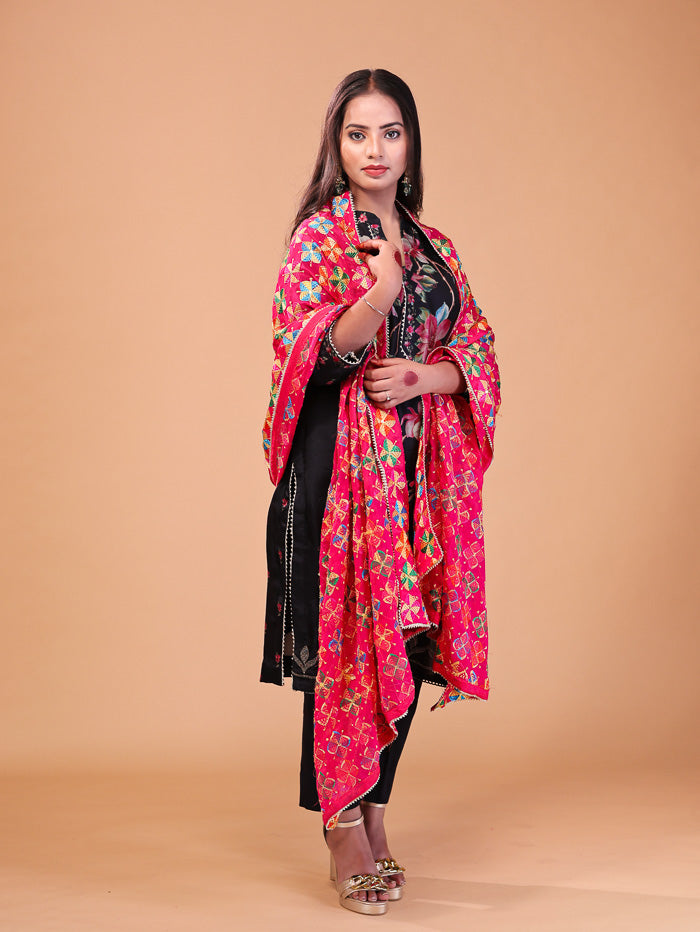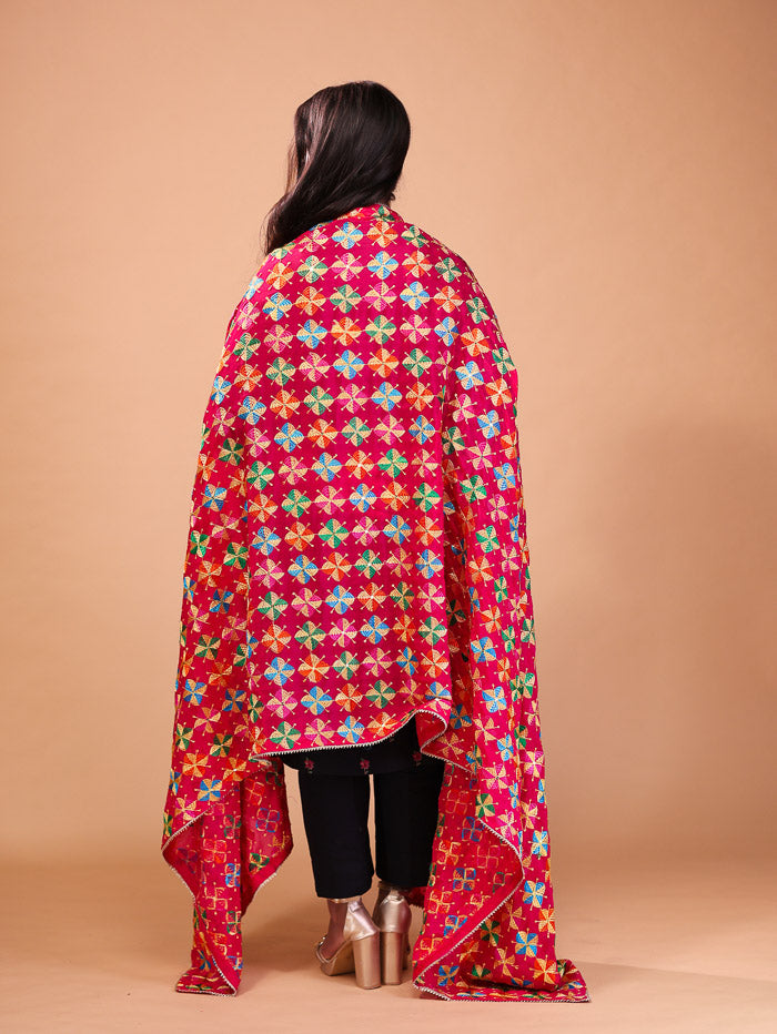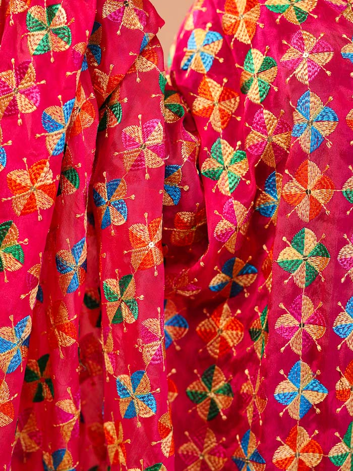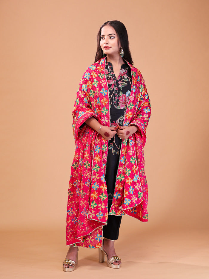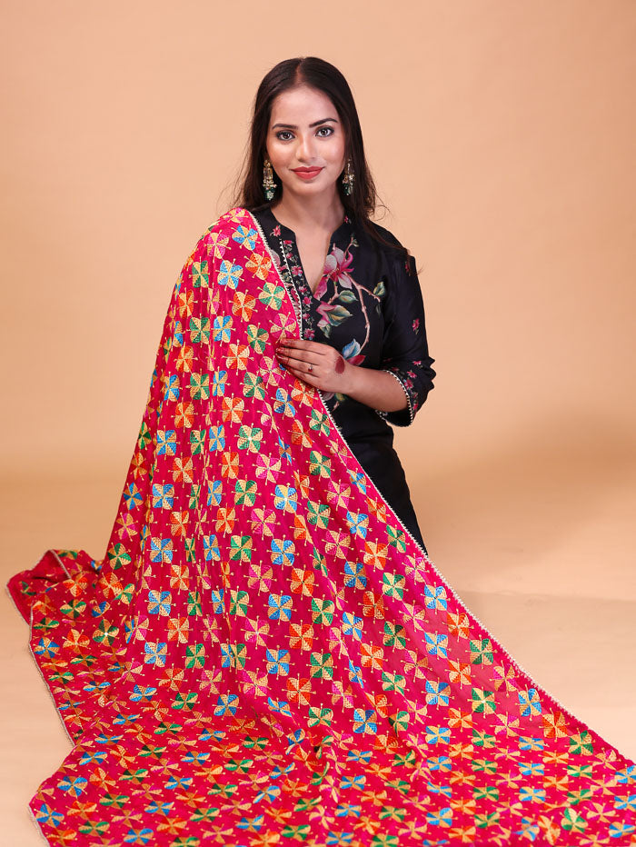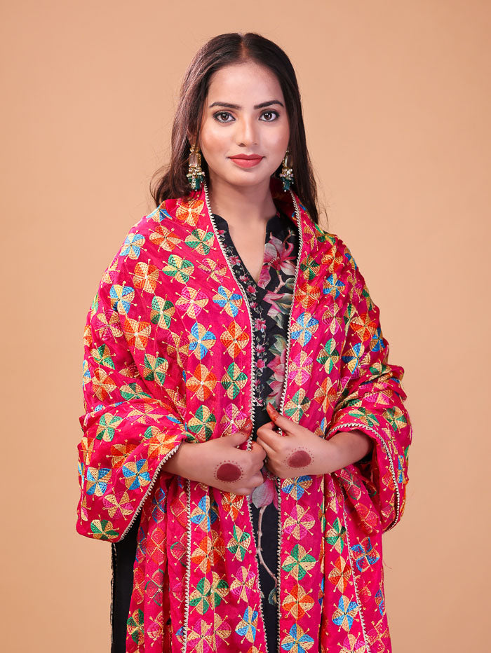 Floral Embroidery Phulkari Dupatta Pink